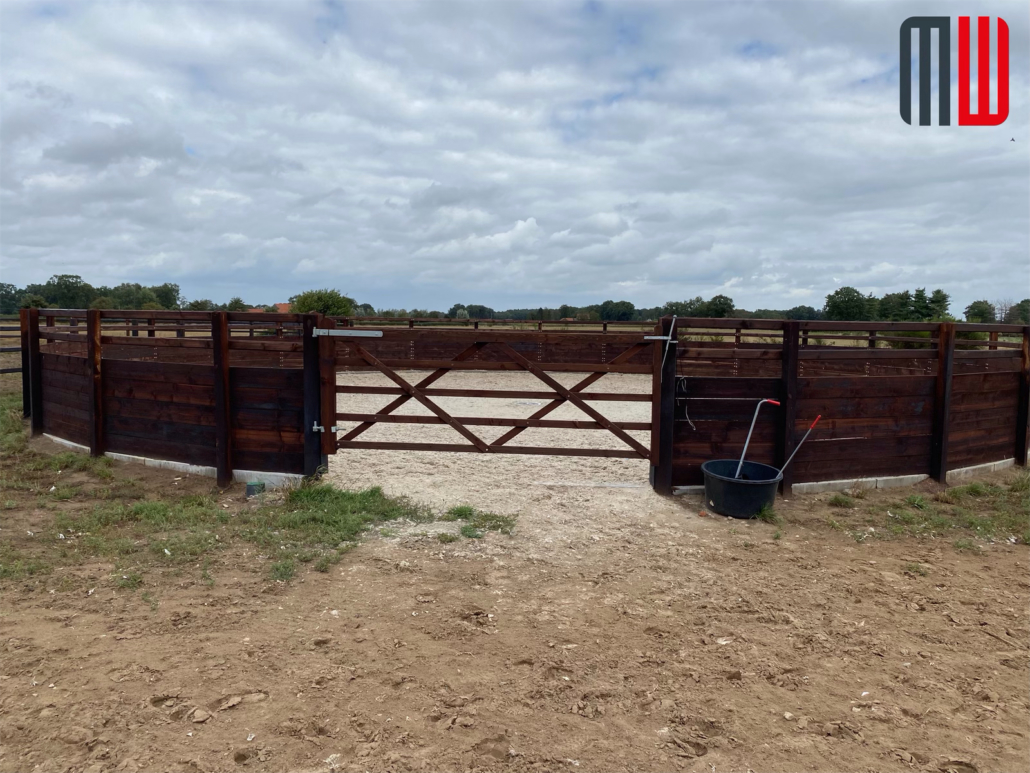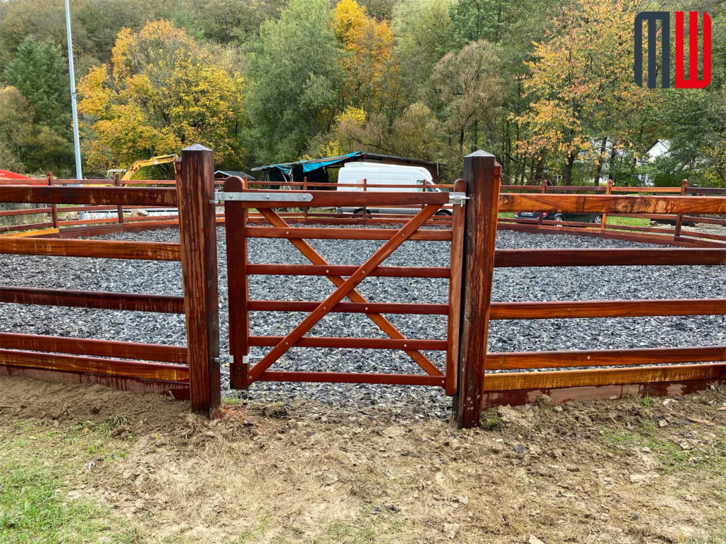 - Poort: Engelse poort 120cmx240cm creosoteerd,geimpregneerd of hardhout,voorzien van 2 poortpalen en worden aangestort.